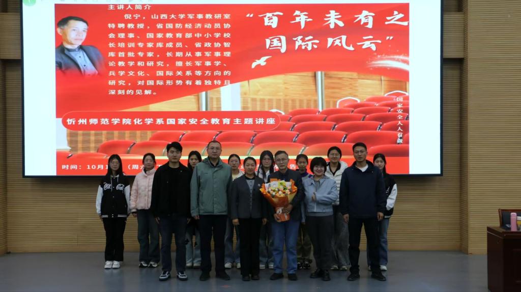 国家安全是民族复兴的根基。为深入贯彻落实习近平总书记关于总体国家安全观的重要论述,增强化学系师生国家安全意识,引导师生树牢“国家安全,人人有责”的使命意识,切实推动总体国家安全观深入人心、落地生根,化学系党总支特邀山西大学军事教研室特聘教授倪宁于10月18日下午在美术楼报告厅为化学系全系师生带来一场题为《百年未有之国际风云》的精彩专题讲座。